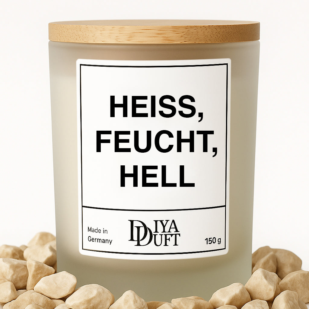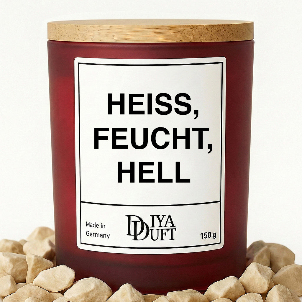 Diese Kerze steht für knisternde Stimmung, Nähe und intensive Momente. „HEISS, FEUCHT, HELL“ ist gemacht für Abende, an denen das Licht gedimmt, die Atmosphäre heiß und der Moment ganz bei euch ist.